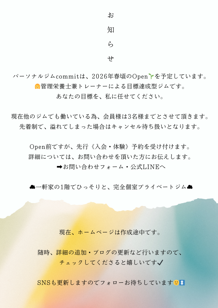 TOP 2025-05-05 パーソナルジムcommitについて > 料金プラン&内容はコチラ > 体験・入会の詳細はコチラ > Before・After例はコチラ > 館内・設備紹介はコチラ > オンラインダイエットプラン > 都度利用レンタルジムcommit >